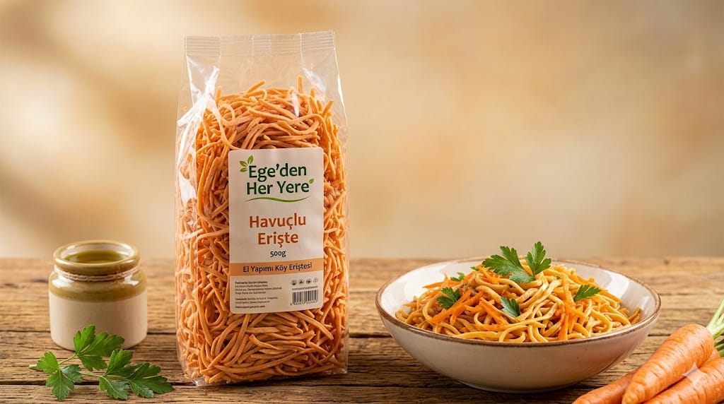 Havuçlu Erişte Ege’den Her Yere tarafından geleneksel yöntemler ile üretilmiştir.